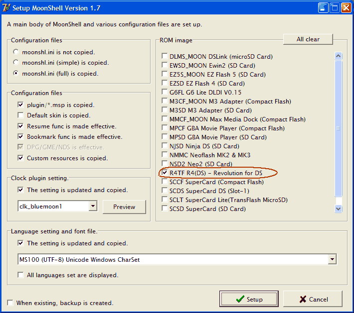 Lo siguiente es identificar nuestro tipo de tarjeta, apretamos Clear All para eliminar las opciones por defecto y seleccionamos solamente la que nos corresponde. En el recuadro Clock Plugin Setting podemos ver un reloj que aparecerá en la DS cuando dejemos la pantalla inactiva por unos segundos, hay varios estilos así que elijan el que más les guste.