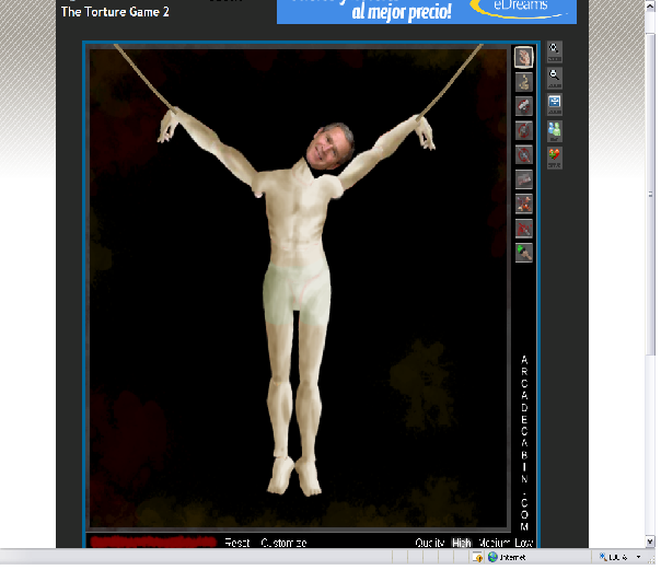 Hoy les dejo un juego flash muy especial, se trata de The Torture Game que como lo dice su nombre, el objetivo es torturar a una persona. Este juego se basa en la creatividad que vos tengas para hacerlo, ya que tienes muchas opciones tanto de armas como de herramientas para hacerlo. Pero el detalle más importante que tiene este juego es que tienes la opción de ponerle la cara de quién vos quieras al muñeco, pudiendo ser alguién que no te cae muy bien. Acá les dejo el link para que lo prueben.
