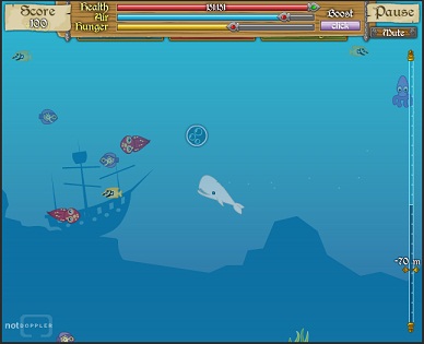 En esta ocasión, te presentamos un juego que tiene como protagonista a Moby Dick, la ballena más famosa. Se trata de un juego en línea desarrollado en Flash, que podrás jugar desde tu PC sin necesidad de descargar ni instalar nada. Sólo debes esperar a que cargue el juego para zambullirte a la aventura. Vale la pena recalcar que este juego es un tanto más pesado que los que solemos presentar aquí, por lo que seguramente notarás que tardará más al cargarse; pero verás que tiene su recompensa armarse de paciencia.