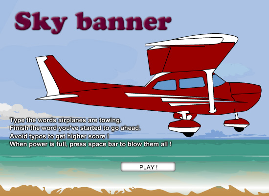 Por otra parte, cada vez que cometes un error de tipeo restas puntos, así que ten cuidado con lo que escribes. Sky Banner es un juego adictivo que siempre te invita a seguir intentándolo. Empiezas con unas pocas palabras que avanzan despacio hasta convertirse en aviones a gran velocidad que tendrás que lograr detener antes de que sea tarde.