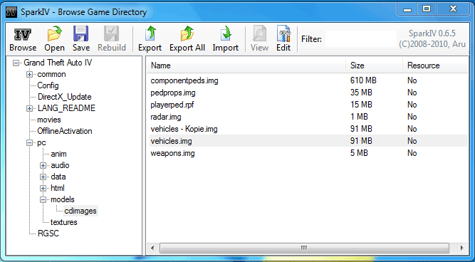 1- Instalamos el Spark IV y abrimos el archivo .exe. Desde la pestaña de Open (Abrir) vamos a la carpeta pc/models/cdimages y abrimos el archivo vehicles.img.