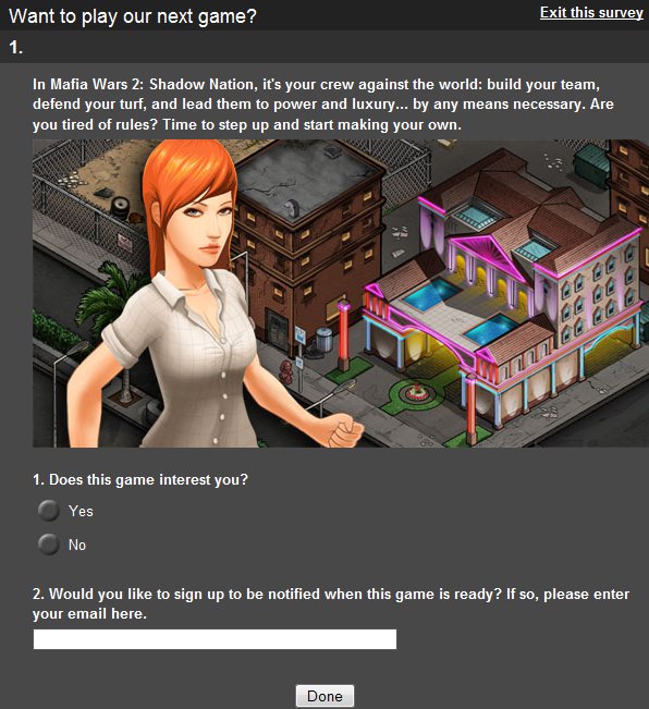 Zynga es la desarrolladora de videojuegos sociales para Facebook con mayor éxito en la historia, ya que ha conseguido convertir la mayoría de sus lanzamientos en las aplicaciones y juegos más populares de Facebook, compitiendo entre ellas a la vez como es el caso actual de CityVille, FarmVille y ahora la nueva Mafia Wars 2.