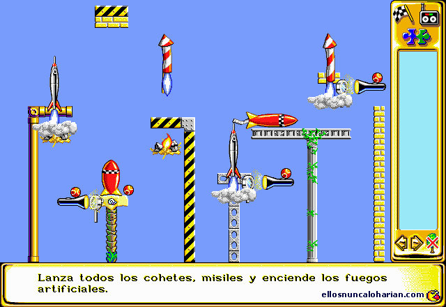 En el juego de Abandonware The Incredible Machine 2, tendremos ayudas reiteradas a lo largo de las pantallas. Aparecen en forma de comentarios como ‘mueve el tostador’ o ‘necesitaríamos una cinta para mover al gato’.