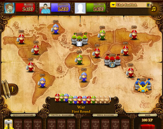Triviador incluye un sistema de chat para que hagas amigos con todos los jugadores de la red social Facebook y a medida que aprendemos a movernos alrededor del mapa, podemos enviar nuestras tropas a diferentes zonas del mundo.