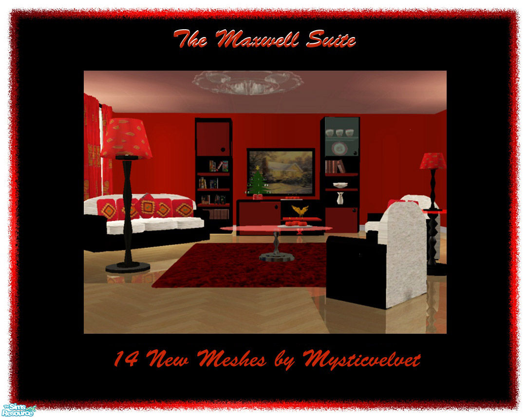 The Maxwell Suite, tiene sillones blancos y es compatible con Los Sims 1 y 2, una opción ideal para parejas de Sims románticos. Una mesita ratona en el centro, de vidrio, con decoraciones que también combinan con el color de paredes y muebles, excelente para los que disfrutan el diseño simétrico y elegante.